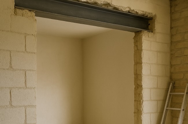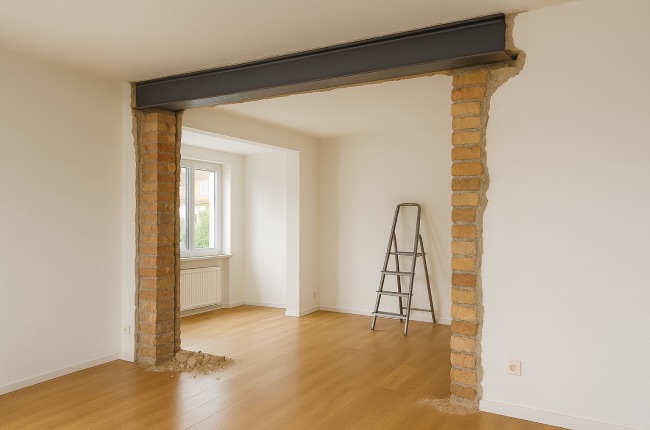Installation d’une poutre métallique pour remplacer un mur ou soutenir un plancher.