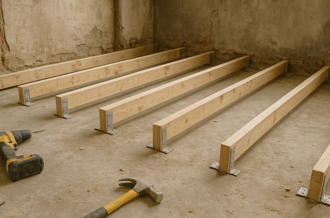 Ajout de renforts sous un plancher en bois ou béton pour le rendre plus solide, par exemple avant d’installer une cuisine ou une salle de bain.